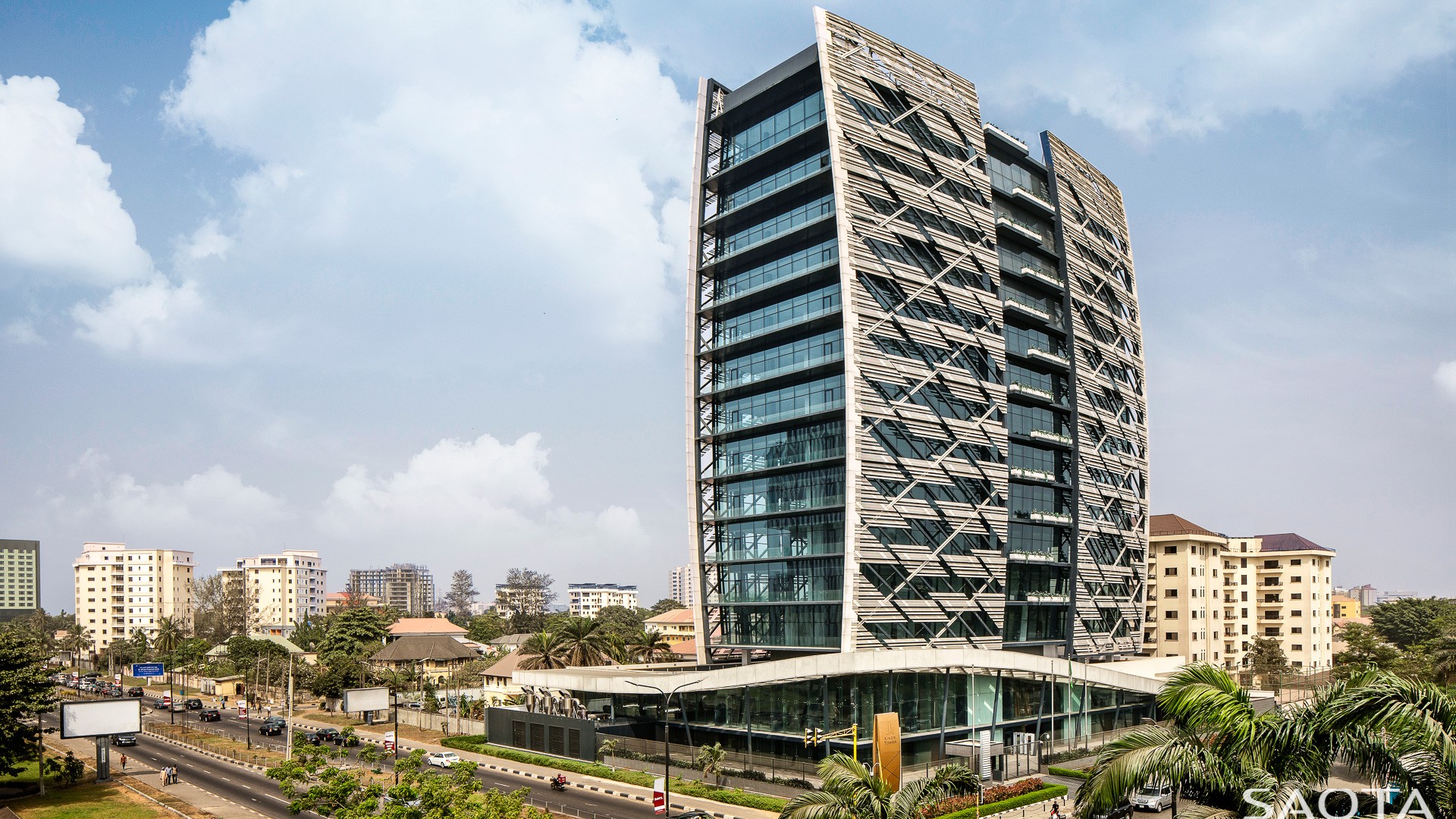 A striking office building in a busy commercial area comprising basement parking, ground floor retail & restaurants and offices. The façade is covered by a screen to add both aesthetic value and shading, limiting the amount of direct sunlight.